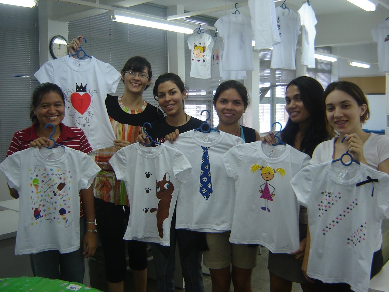 Gente foi muito bacana a aula de pintura em tecido que ministrei para as alunas de Desing de Moda da Faculdade Católica do Ceará com direito a chocolate e apostila com passo a passo de como pintar com molde vazado. Trabalhamos com o tema infantil em camizetas para as crianças da Casa da Acolhida uma entidade do Grupo Marista para crianças carentes.